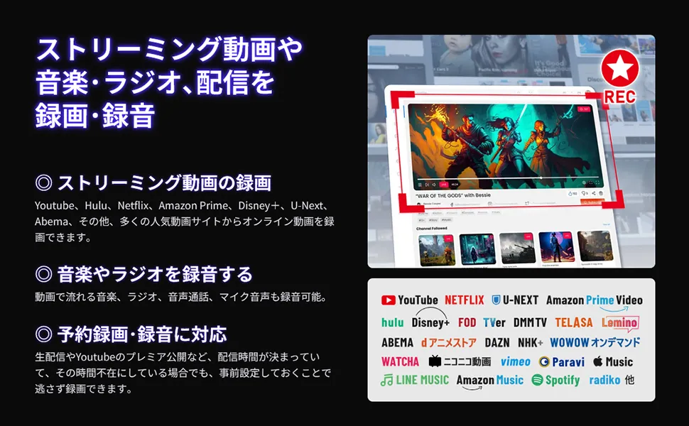 All★Recorderは、Tver、Abema、YouTube、ニコニコ動画などの見逃し配信の録画に対応しており、 ライブ放送は、スケジュール(予約)録画も可能です。録画した番組は付属ソフトで再生できます。 PCとTVをHDMIで接続すれば、TVの大画面でも楽しめます。