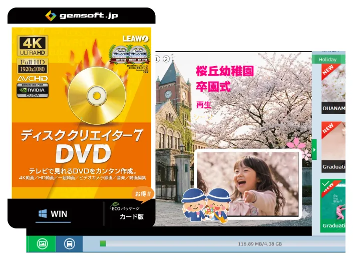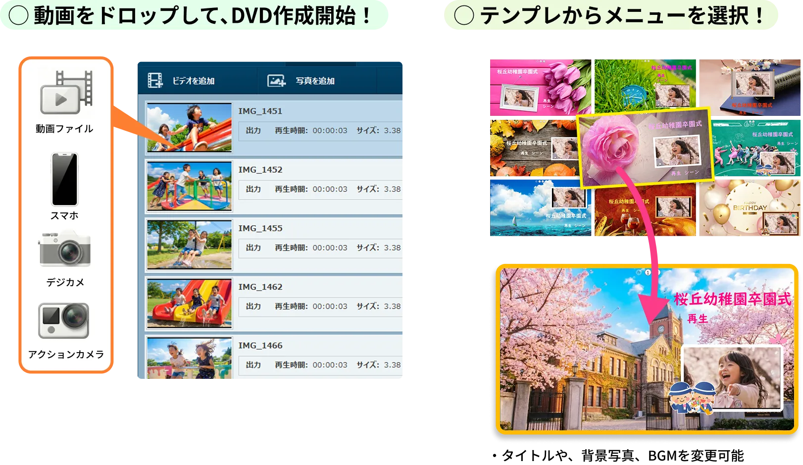 付属アプリで、再生時に表示されるメニューを自分で作れます。またDVD作成時に、明るさ調整、不要部分のカット、スマホで撮った動画を横向きに直すなど、専門知識がなくてもきれいなDVDが作れます。