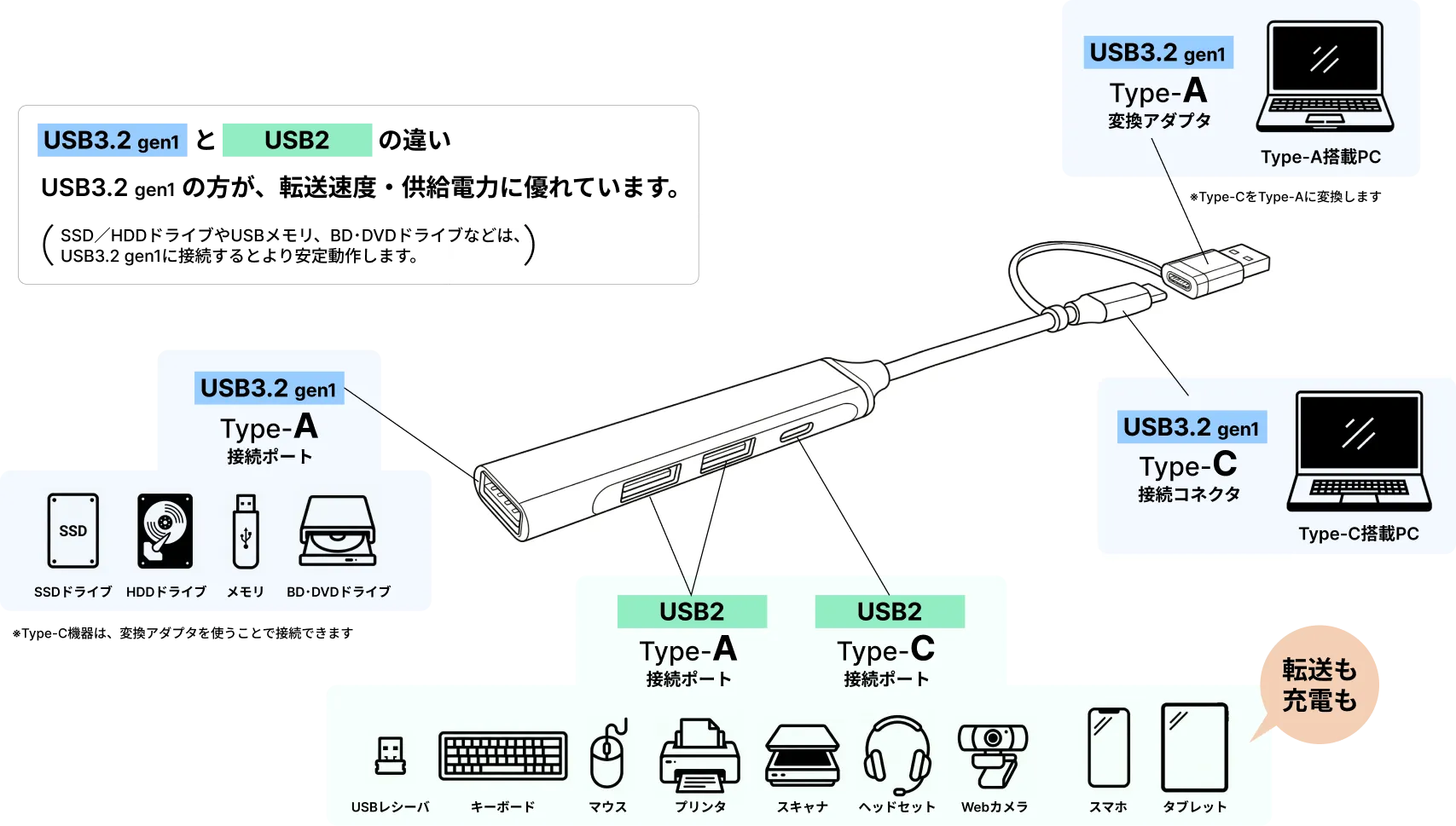 マウス、キーボード、USBメモリ、スマホ充電... パソコンのUSBポート不足もUSBタイプ違いも、USBハブが解決。