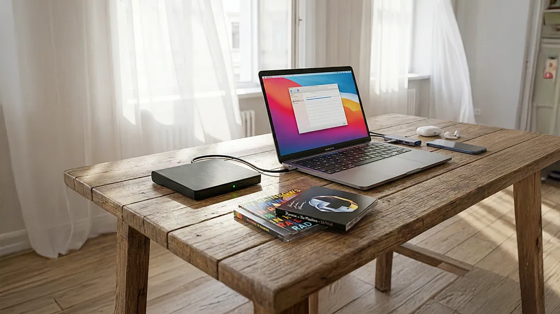 軽くてコンパクトなDVDドライブとUSBハブだから、カバンに入れても邪魔にならない。バスパワー駆動なので外部アダプタもなくてさっぱり。移動先、ホテルや新幹線の中でもいつも通り使えます。