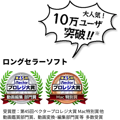 受賞歴:第45回ベクタープロレジ大賞 Mac特別賞 他、動画鑑賞部門賞など 受賞多数